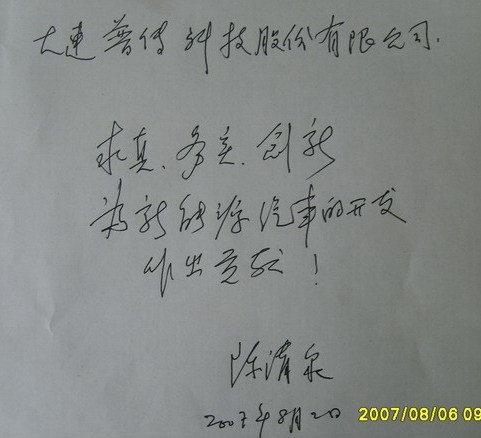 2007-8-21 9:03:05陳清泉院士為我公司題詞 2007年8月3日,2007混合動(dòng)力汽車控制技術(shù)研討會(huì)第二次會(huì)議哈爾濱召開,參會(huì)期間,全國政協(xié)委員、國際電動(dòng)車領(lǐng)域權(quán)威專家陳清泉院士聽了普傳科技關(guān)于混合動(dòng)力汽車關(guān)鍵部件電機(jī)及控制器的技術(shù)和產(chǎn)業(yè)化發(fā)展介紹后欣然題詞:“求真、務(wù)…